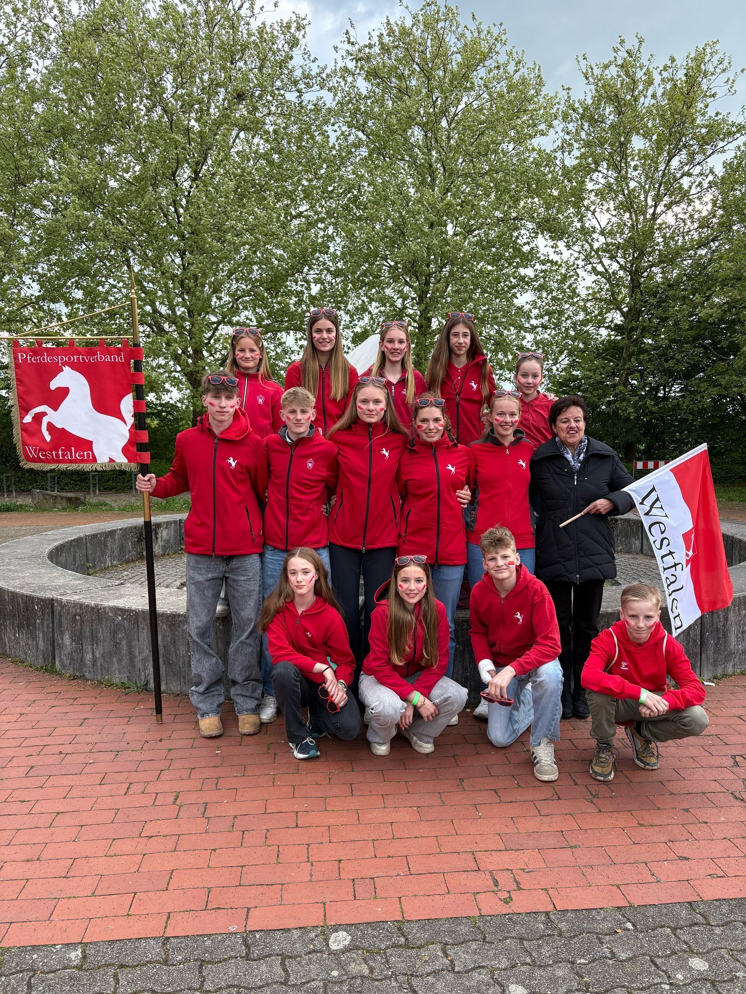 Am vergangenen Wochenende machte sich Theresa Stöcker mit ihrem Pony Palomina und der Mannschaft Westfalen auf den Weg nach Achern (Baden-Württemberg) zum Deutschlandpreis der Nachwuchsvierkämpfer. Hierfür hatte sie sich nach ihren guten Leistungen beim Westfälischen Vierkampf qualifiziert. Nach einer neuen persönlichen Bestzeit im Schwimmen und einer guten Leistung im Geländelauf, überzeugte Theresa vor allem im Reiten mit ihrer Palomina und sammelte Traumnoten: ihre Leistungen wurden mit einer 8,5 in der Dressur und einer 8,2 im Springen belohnt. Auch ihre Mannschaftskolleginnen konnten mit guten Leistungen überzeugen und somit landete das Team auf Platz! Wir gratulieren Theresa und ihrem Team von Herzen zu diesem tollen Erfolg!
